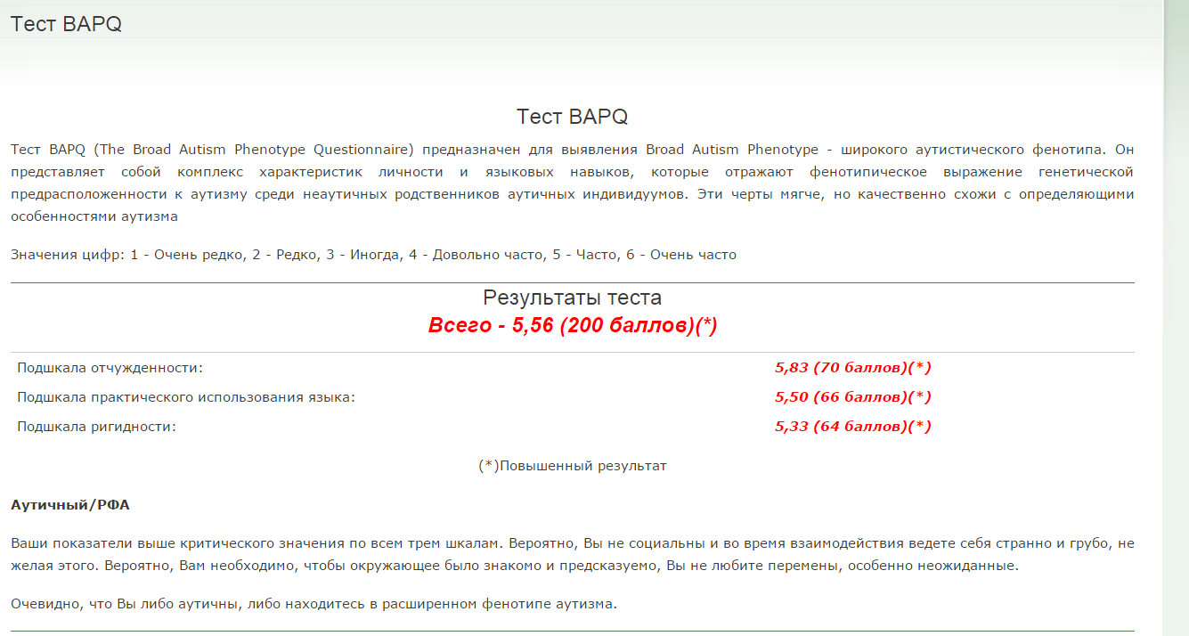 Расширенный фенотип аутизма - не аутизм, а крайний вариант нормы. Хотя, естественно, в случае синдрома Аспергера/высокофункционального аутизма тест BAPQ также будет показывать повышенный балл.babushka писал(а):И что, менять статус?