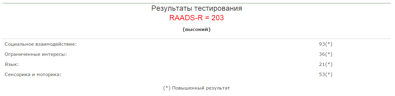 RAADS-R = 152 (высокий)